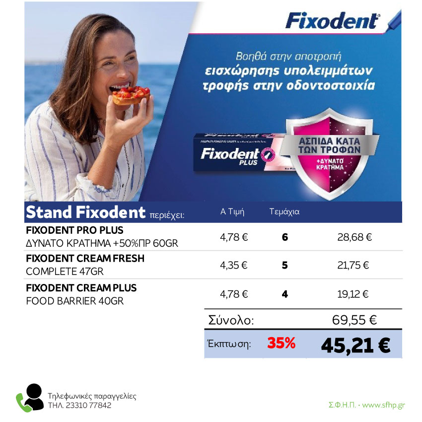 FIXODENT STAND (5X COMPLETE ORIGINAL 47GR + 4X PLUS FOOD BARRIER 40GR + 6X PRO PLUS ΔΥΝ ΚΡΑΤ +50% 60GR)