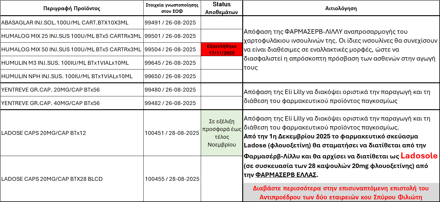 Η Φαρμασέρβ-Λίλλυ σας υπενθυμίζει τις παρακάτω Οριστικές Διακοπής Διάθεσης στο τέλος Νοεμβρίου