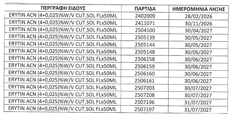 Κατόπιν ανακοίνωσης του ΕΟΦ ανακαλούνται οι παραπάνω παρτίδες του εν λόγω σκευάσματος που περιέχουν την δραστική α ύλη Erythromycin παραγωγή του εργοστασίου SM BIOMED Μαλαισίας, λόγω ανάκλησης του πιστοποιητικού CEP του παραγωγού.